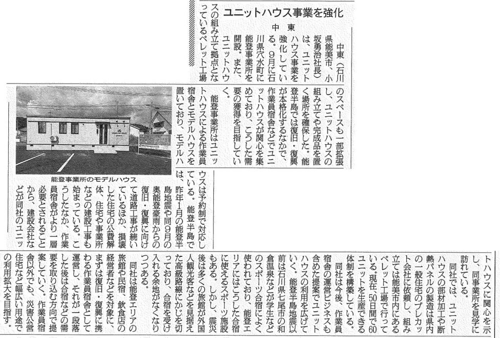 2025年11月10日(月)の木材新聞に、「ユニットハウス事業を強化」の記事が掲載されました。